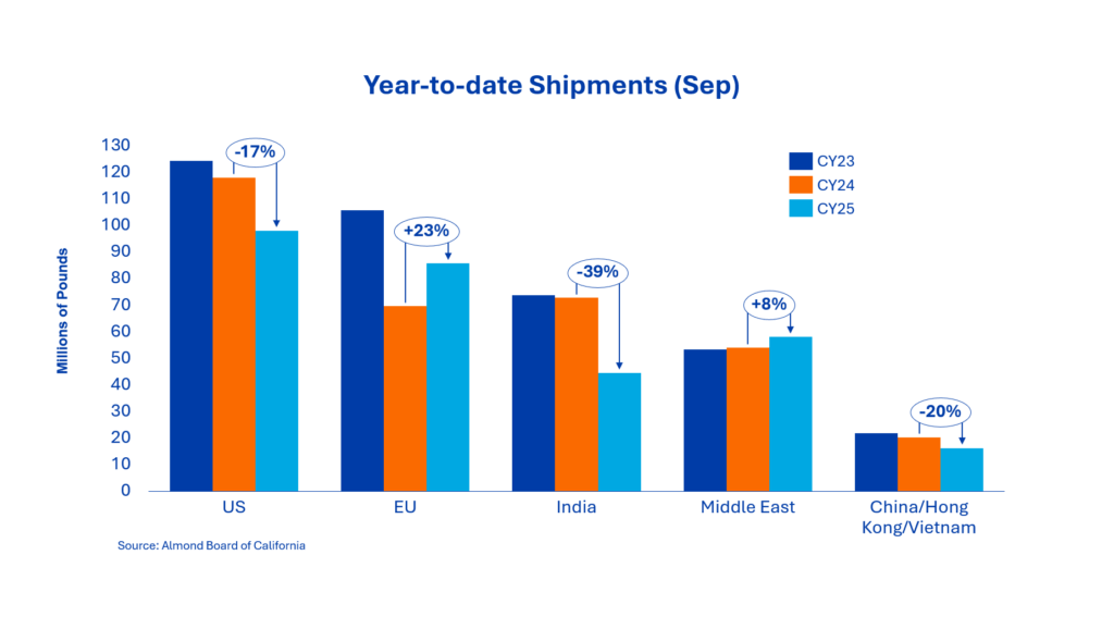 China/Hong Kong/Vietnam: Shipments to the broader region totaled 12.0 million pounds in September, led by Vietnam’s strong performance of 10.6 million pounds, which was an increase of 139%. China/Hong Kong experienced a sharp decline of 86% for the month with a turnout of 1.4 million pounds. The divergence reflects the ongoing trade rebalancing between direct and transshipment channels, with China maintaining conservative coverage ahead of Chinese New Year. Vietnam’s strength has been underpinned by increased kernel processing and re-export activity into Southeast Asia.